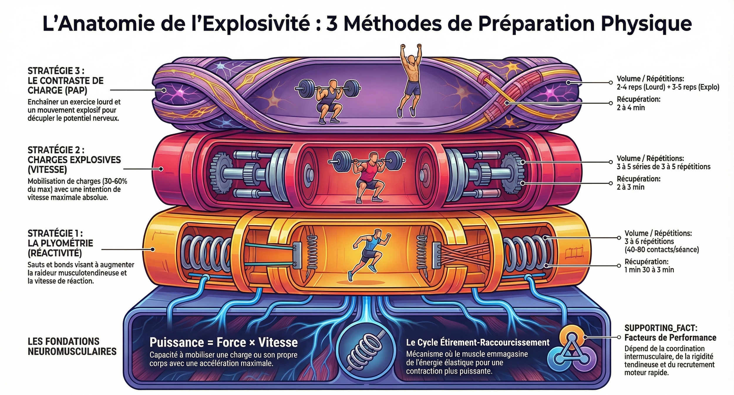 Le développement de l’explosivité repose sur des principes précis et des méthodes complémentaires. La plyométrie améliore la réactivité, le travail en charges développe la puissance, et le contraste permet d’accélérer les adaptations neuromusculaires.